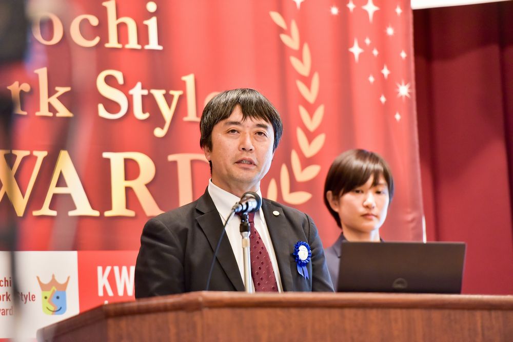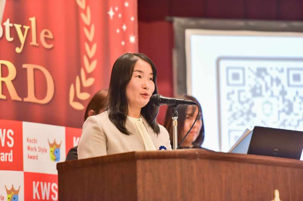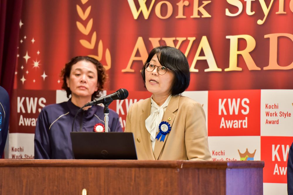 ●有休消化やDX化を始め「『好き』」を力にプロジェクト」等、多方面からの取組はもちろんであるが、なかでも「子連れ出勤」や、労働者が出産・育児や介護等、ライフステージに合わせた働き方を選択した際にも役職とキャリアをそのまま移行できる給与体系の導入など、労働者のキャリア形成において子どもや老親がいることがハンデとはならない、企業が労働者と「共育て」を実践している取組を高く評価します。(高知労働局職業安定部 訓練課長 都築美穂 氏)